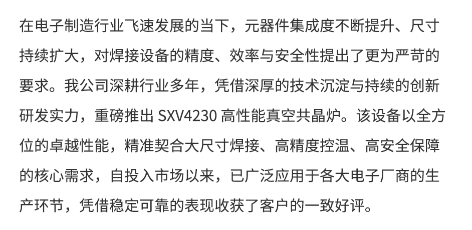 1、升温速度最高2℃/s,降温速度最高2℃/s; 2、温度范围:室温~450℃; 3、真空水平可达0.001mbar; 4、真空度达到设定值后稳定10min的误差≤±5%; 5、加热板面积:420*300mm、 6、温度均匀度:±1.5℃% 7、焊接质量:大面积焊盘空洞率≤5%;小焊片空洞率≤2% 8、加热平台:碳化硅镀层的石墨加热平台; 9、配备可连续电动变倍自动对焦可视系统,视野≥400mm×300mm,像素≥800w。可清晰捕获样品可视焊膏融化形态以及虚焊、桥接、偏移等缺陷类型 10、气路及流量监控:配置2路气路(气路管路防腐蚀),每路气体配置MFC流量计; 11、加热方式:顶部(辐射)+底部(接触)加热,功率可调; 12、监视窗口:视觉监控窗口:≥1个; 13、安全性:紧急停止按钮、舱门未到位保护、气压/水温超限报警; 14、加热腔式内含有≥5路测温热电偶; 15、气体:氮气、甲酸系统; 16、炉膛高度:可加工器件高度≥80mm; 17、加热板承重:≥10KG; 18、配置真空干泵抽速≥36m³/h; 19、自动化:配备工艺曲线编程功能,回流曲线每次使用后有记录可以查询,记录中应包含腔室真空度变化情况以及传感器检测的温度变化情况; 20、配有甲酸泄漏监控报警,必须可以检测。 21、设备管路材质须采用不锈钢材质,不能采用铁质材料。 22、设备主界面能显示焊接过程实时温度、HCOOH和氮气气体状况、真空度等,形成实时曲线自动保存。 ( 23、软件系统:升降温可编程控制,可根据工艺设置升降温曲线,每条曲线都可自动生成,可编辑、修改、存储等; ( 24、真空能力:30秒内从大气压抽到1mbar,抽真空控制阀门开合度在工艺任意阶段任意可调。 25、工控软件要求 (1)用户权限分级管理; (2)系统显示屏可事实提示故障信息,工艺自动控制,能够监测参数,具有互锁等安全措施; (3)可对工艺配方进行创建、删除、修改等操作;程序工艺参数,如功率、温度、气体种类和流量、时间等可以设定和显示; (4)设备运行log记录功能:设备正常运转run货信息,设备event,alarm有查看记录功能,历史数据至少存储3个月,log支持导出;具有双硬盘功能,预防潜在的数据丢失; (5)软件为自主开发,厂家具备对软件的维护能力,质保期内,免费提供软件维护升级服务,质保期后Bug免费优化; (6)I/O信号:对于设备各个动作,信号能有I/O信号查看功能; 26、MES/EAP通信接口要求 (1)设备支持SECS以及GEM200标准协议(E4 E5 E30); (2设备厂商能够提供SECS manual与SECS测试log,包括EAP初始化、EAP控制跑货的SECS指令、Lot 跑货Event等全流程log; (3)设备因自身问题导致和EAP断连,需要有相应的恢复机制。 27、 安全性要求 a)安全互锁:舱门未关闭时禁止启动加热及真空系统。 b)紧急停止系统:至少安装1个急停按钮,按下后立即切断主电源并启动声光报警。 c)报警与监控:实时监测温度、真空度、气压、水温,超限时分级报警并记录日志;配置视觉监控系统,焊接过程视频同步录制。甲酸泄露报警,超温超时报警,冷却水流量检测。 |